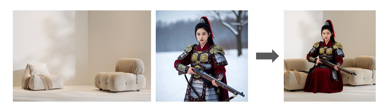 prompt = "Let the ancient costume beauty in the second picture sit on the sofa in the first picture"