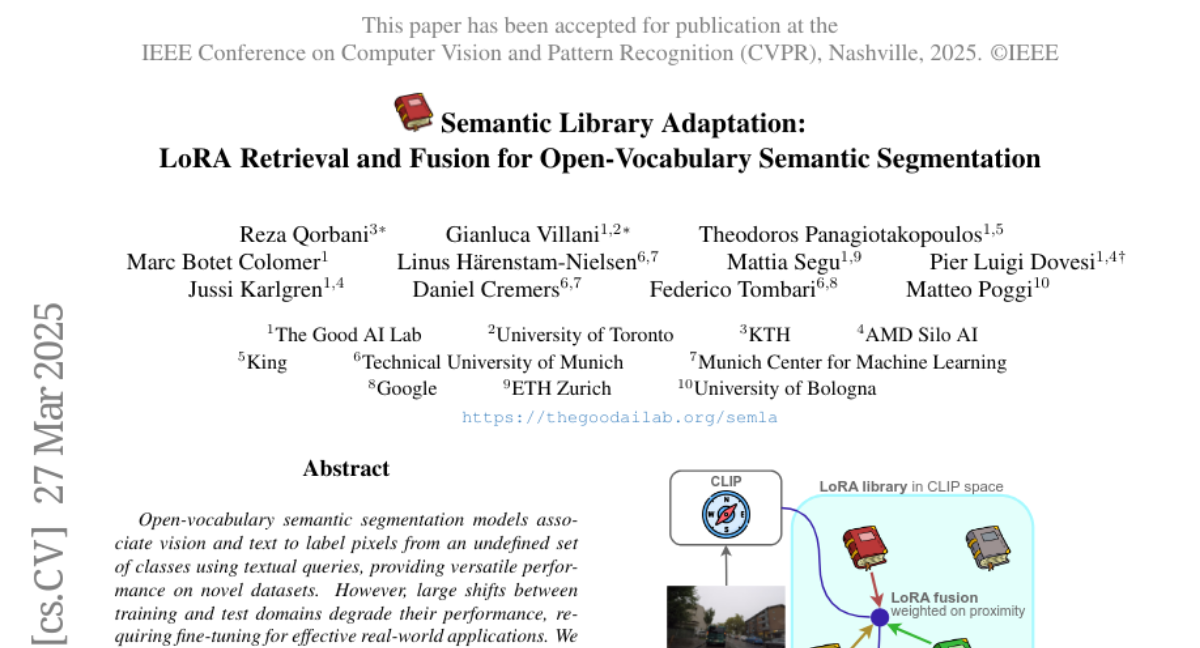 CVPR2025 Semantic Library Adaptation: LoRA Retrieval and Fusion for Open-Vocabulary Semantic Segmentation Paper • 2503.21780 • Published Mar 27, 2025 • 9